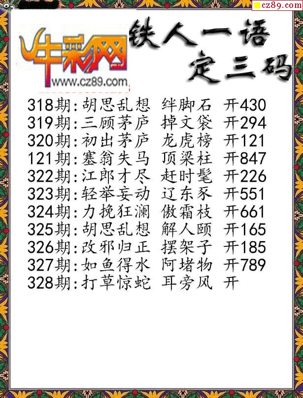 > 福彩3D2025328期铁人一句定三码字图谜